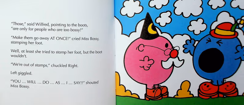 Little Miss Bossy thinks she can boss almost anyone around, that is until she tries on a new pair of bossyboots!