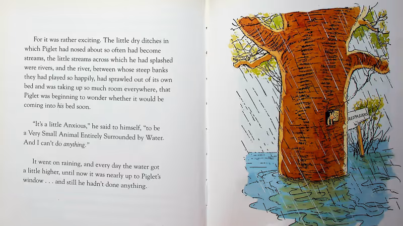 When Piglet is entirely surrounded by water, there seems to be no hope of escape. Then Winnie-the-Pooh comes to the rescue with a rather brilliant ideea