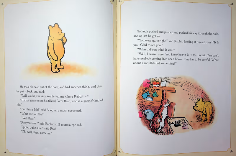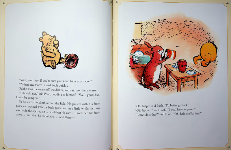 Winnie-the-Pooh always likes a little something to eat, but when he goes to visit Rabbit he finds he can't quite make it out the door. This little storybook introduces young readers to the characters in the Hundred Acre Wood.