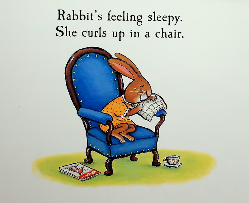 "Rabbit's feeling sleepy. She curls up in a chair.